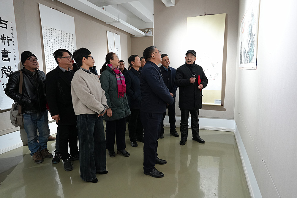 图为出席书画展开展式的各界嘉宾观看展出的书画精品。