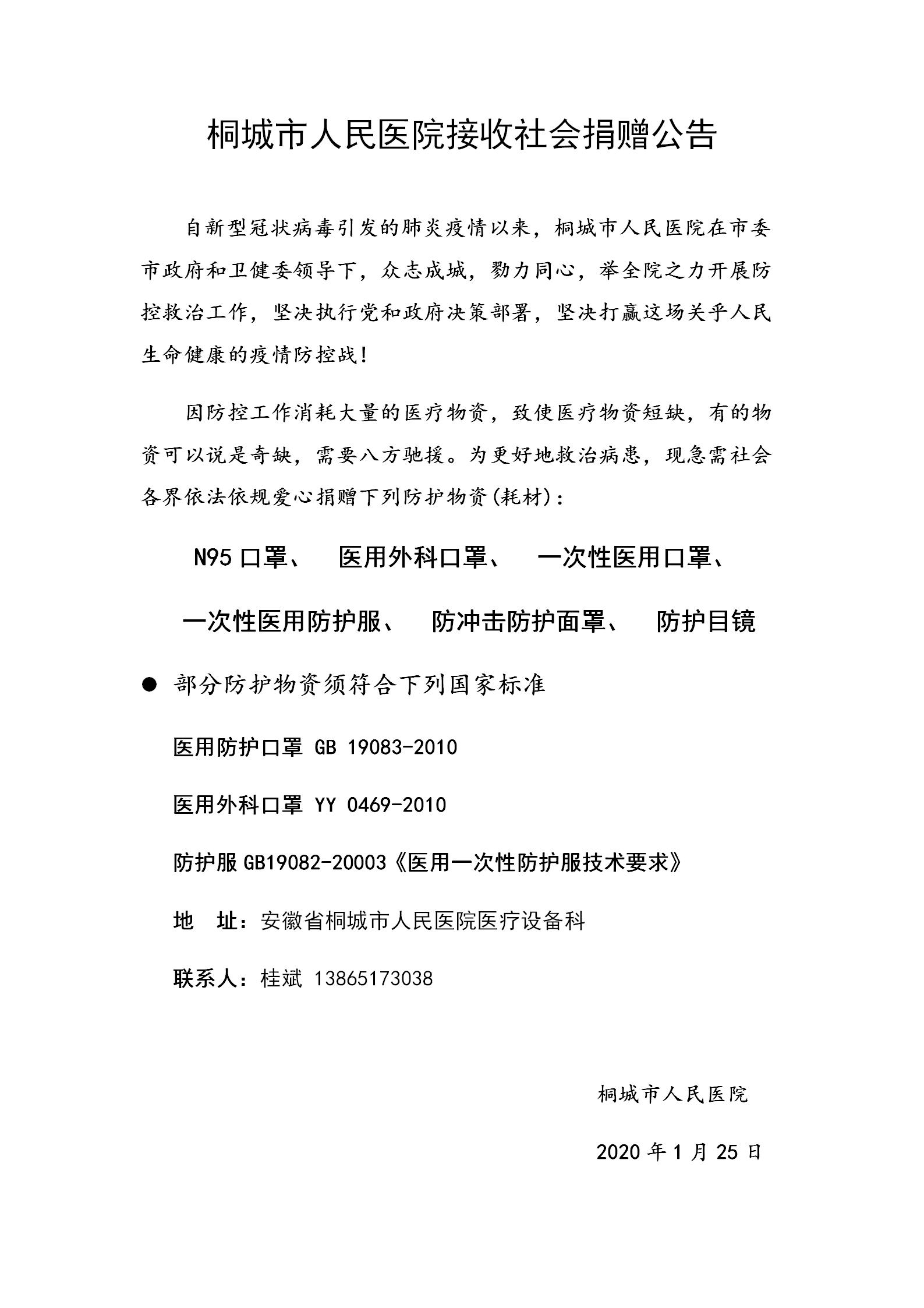 实物捐赠见桐城市人民医院接受社会捐赠公告
