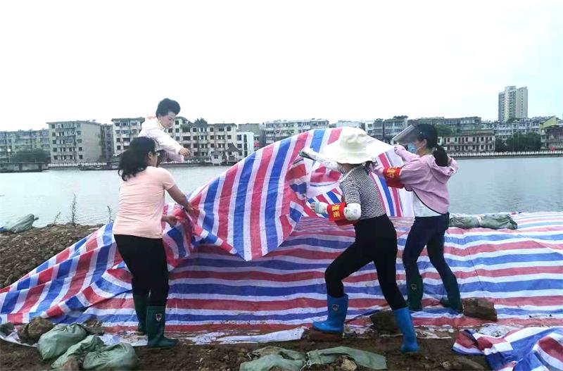 “快看,那里护堤塑胶布被风吹起来了,大家赶快合力盖起来。”语罢,鲟鱼镇女子查险队的队员们迅速行动,将塑胶布复归原位,并且搬来沙包压紧压实。