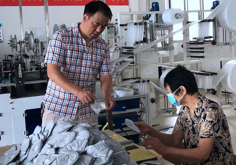 一开始,徐宏杰的口罩厂只有5个人,用缝纫机做劳保口罩。那时,青草镇的口罩都是缝纫机缝制的,效率低,品种单一。2008年,徐宏杰在镇上第一个尝试用机器代替人工,逐步添置多台口罩生产机器。“生产能力大大提高了,也降低了用工成本。”徐宏杰说。