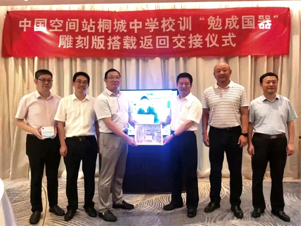 8月19日,由神舟十四号飞船搭载前往中国空间站的桐城中学校训“勉成国器”雕刻版返回交接仪式在京举行。此举标志着桐城中学“校训”圆满完成太空之旅。省市重点中学校训进入中国空间站,在我国尚属首次。搭载原件将分别存放于中国·桐城文化博物馆和桐城中学校史馆。 中国载人航天工程办公室主任郝淳、主任助理季启明出席交接仪式,向桐城市委副书记、市长刘存磊,市委副书记洪长久,桐城中学党委书记、校长曹向东,副校长方钊莹进行交接。 桐城中学与中国航天事业渊源颇深。一大批桐中校友都在中国航天系统各个岗位上默默奉献。航天精神也激励着一代又一代的桐中学子,秉承“勉成国器”之校训,为辉煌而伟大的航天事业不断探索前行。