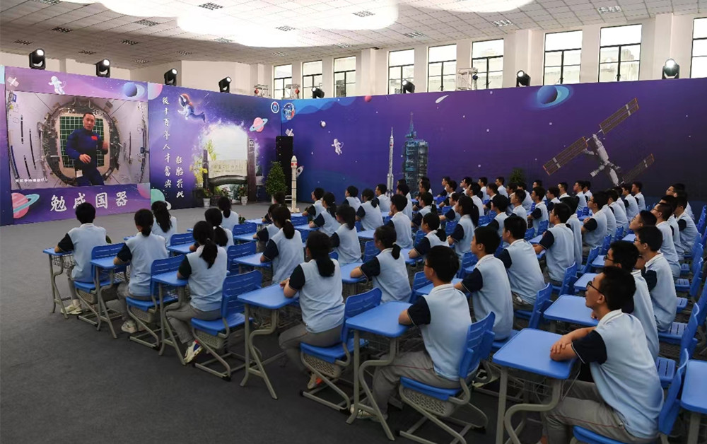 图为桐城中学“钱学森”班学生在集中收看“天宫课堂”。 2022年,为庆祝桐城中学建校120周年,经桐城中学申请、中国载人航天工程办公室批准,桐城中学校训“勉成国器”以邮票雕刻版的特殊艺术形式,由神舟十四号飞船搭载运往中国空间站,并由神舟十四号航天员刘洋在轨展示。 “天宫课堂”授课结束,学生们纷纷表示对航空航天领域的兴趣更大了。“桐城中学将鼓励更多学生参加物理竞赛和科学社、航模社的社团活动,更好地帮助学生学习掌握航空航天相关知识,助力学生实现航天梦想。”桐城中学副校长方钊莹说。 桐城中学地面课堂是此次全国五个地面课堂之一,另外四个分别设在北京、内蒙古额济纳旗、陕西延安、浙江宁波。 中央广播电视总台面向全球现场直播了此次“天宫课堂”授课活动。 (汪桂云) |